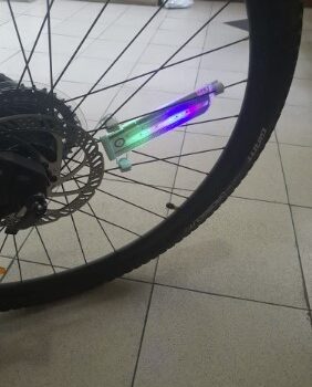 This is pretty cool LED light for bicycle wheels. Each light comes with 3 small batteries. It has motion sensor. It only lights up, when the wheel is moving, when it's stopped - it turns off in few seconds. It has a connector for kids' bikes and fits regular valves (the same as the car one).
