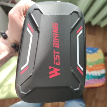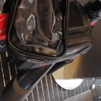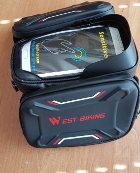 “This works great on my bike. The two side pockets are great for small bike tools and my small wallet. The plastic screen over the phone works great. I have no issues using my phone. It keeps my phone dry and safe.”